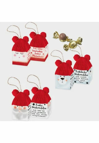 niedlicher Geschenkanhänger mit gestrickter Mütze