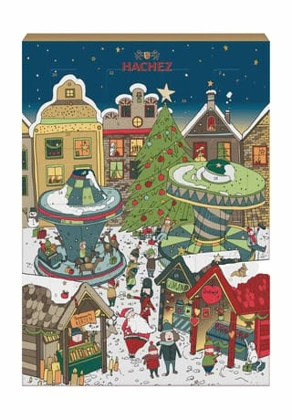 im Detail: Weihnachtsmann Vollmilch-Chocolade, Orange Knusper-Nougat, Marzipan, Chocoladen-Mousse, Apfel, Tiramisu-Trüffel, Vanille-Trüffel, Edel-Marzipan, Noisette, Marc de Champagne-Trüffel, Mandel Vanille, Bitter-Orange-Trüffel, Caramel-Trüffel