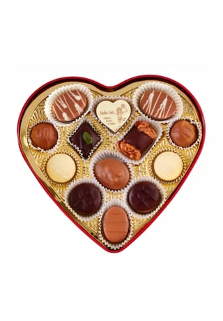 liebevoll zusammengestellte Auswahl feinster handgefertigter Pralinenspezialitäten in einer edlen Herzdose aus Metall