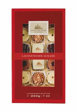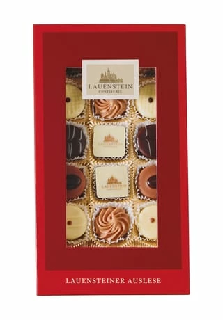 Sorten: Kaffee-, Prosecco-, Cointreau-, Jamaica Rum- und Confiserie-Trüffel sowie Nougatwürfel, Nougattörtchen und Blätterkrokantröllchen