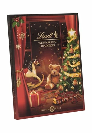 Adventskalender mit 24 Pralinen aus Alpenvollmilch-Schokolade und gefüllten Vollmilch-Schokoladen