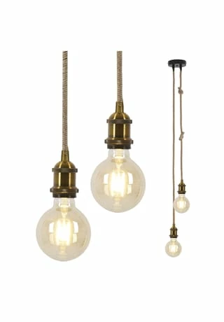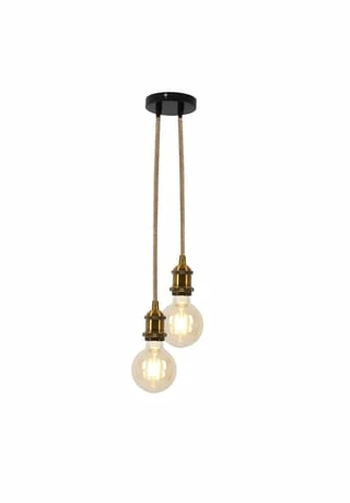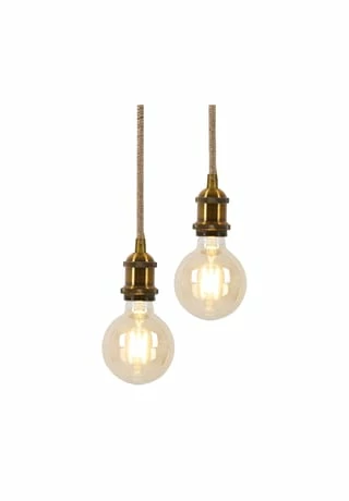 excl. 2x E27 max. 10W LED Leuchtmittel IP20/SKII 220-240V~ 50Hz hges: 90cm; d: 15cm; Material: Metall, Jute Fassung: altmessing Baldachin: schwarz