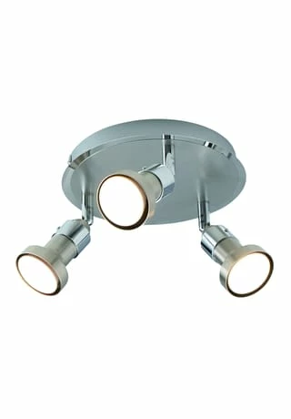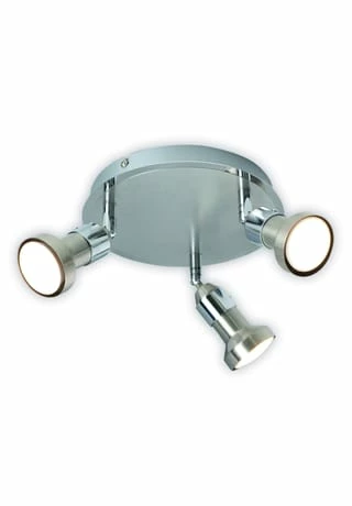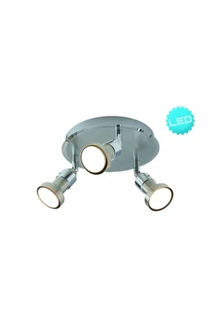 3x GU10 max. 10W je Spot incl. 3x GU10 LED (Artikel-Nr.: 4106426) Total: 15W; 1263lm Je Lampe: 5,04W; 421lm 3022K; 20000h; n: 12500x Ra>80 220-240V~ 50Hz D:20cm;D Spot:6cm;T:15cm Material: Metall Farbe: chrom, stahl-blank
