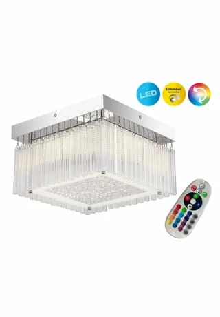 incl 90 LEDŽs total 28W 4146K; 2870lm; 20.000h Energieeffizienzklasse F SKI; IP20 incl. Treiber 100-250V~ 50/60Hz 12V DC incl. infrarot Fernbedienung incl. 2x AAA 1,5V Lichtfarbe/Programm: weiß – permanent u. dimmbar RGB: einzeln oder als Farbwechsel zuschaltbar l: 30cm; b: 30cm; h: 17,5cm Material: Metall (Eisen), Glas Farbe: chrom, klar Lichtfarbe: neutralweiß