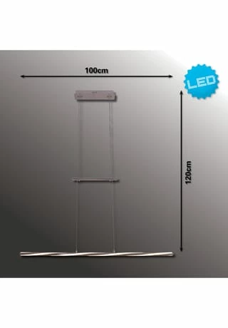 incl. LEDs total 24W 900lm; 3000K; 20.000h Energieeffizienzklasse G incl. Treiber 220-240V~ 50Hz h: 120cm; l: 100cm; t: 8,5cm dimmbar höhenverstellbar mit Jojo-Funktion Material: Metall (Eisen, rostfreier Stahl, Aluminium), Acryl Farbe: chrom Lichtfarbe: warmweiß