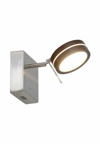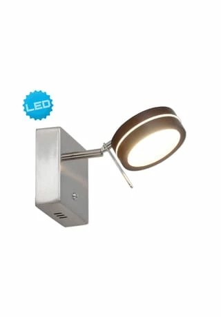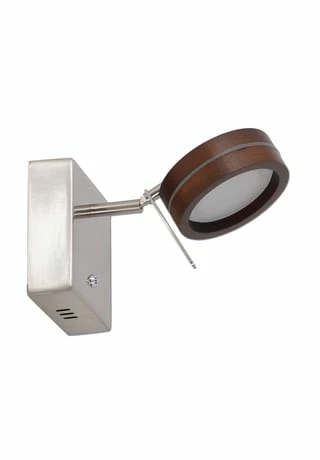 incl 1 LED 8,5W 3000K; 520lm; 20.000h Energieeffizienzklasse G IP20; SK II incl. Treiber 220-240V~ 50Hz 24V DC I=0-500mA Spot schwenkbar dimmbar per Ein/Aus Taster h: 11cm; b: 11cm; t: 19cm Material: Metall, Holz Holzart: Eiche Herkunftsland: Thailand Farbe: braun, satiniert Lichtfarbe: warmweiß