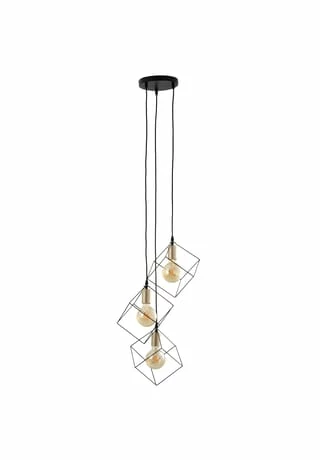 excl. 3x E27 max. 40W IP20; SKI 230V~ 50Hz 3xSchirme je: s: 16cm Pendellängen: 76cm; 94cm; 112cm; schwarz Gesamthöhe: 146cm; b: 39cm Baldachin: h: 3cm; d: 19cm / schwarz Material: Metall (Eisen), Kunststoff Farbe: schwarz Lampenfassung: gold