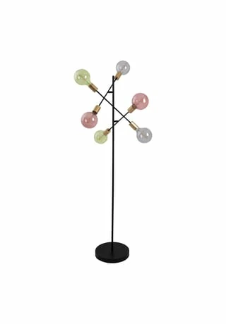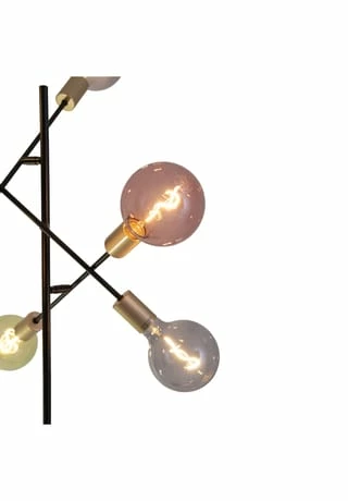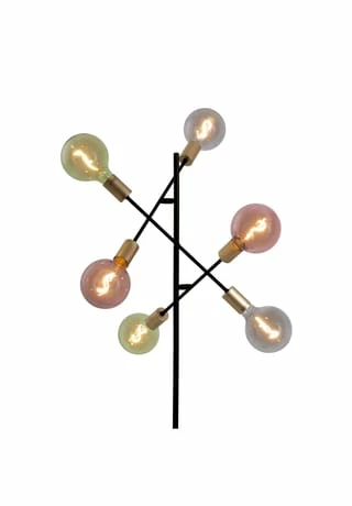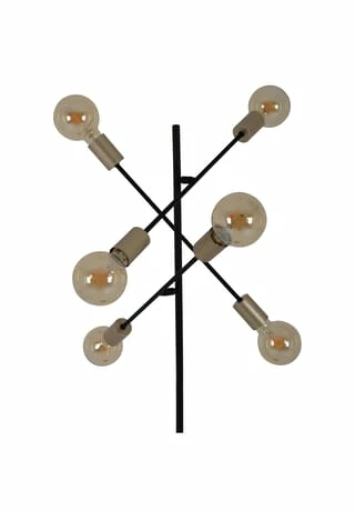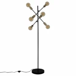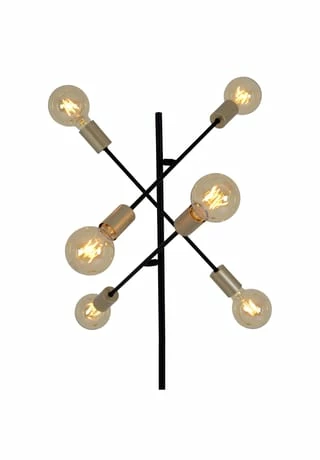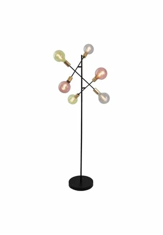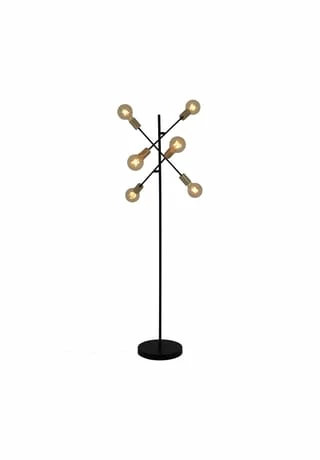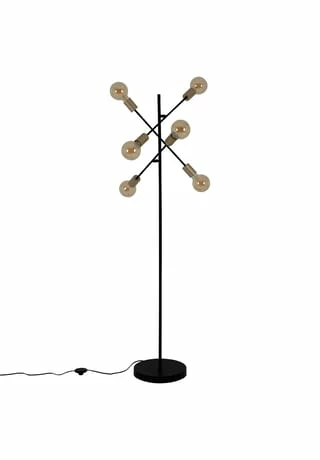 6x E27 max. 40W excl. Leuchtmittel IP20 /SKII 230V~ 50Hz Maße: h: 150cm; b: 49cm Fuß: h: 4,5cm; d: 28cm Zuleitung: 146cm; schwarz incl. Tippschalter/Fußschalter Material: Metall (Eisen), Kunststoff Farbe: Gestell schwarz, Lampenfassung gold